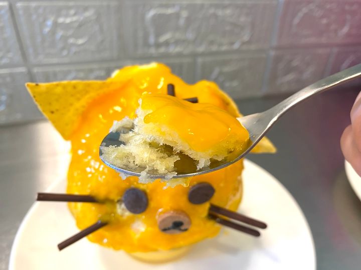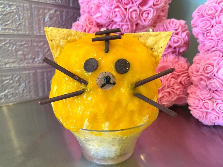 「トラ」1400円は、ベースにミルクシロップを使い、外側にはマンゴーシロップがたっぷりとかかっています。スプーンですくって食べてみると、夏らしいすっきりとしたマンゴーの酸味が濃く広がってきますよ。