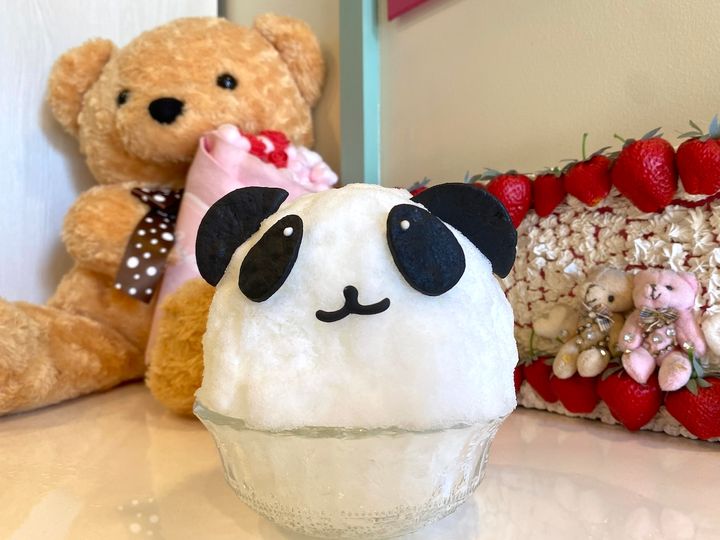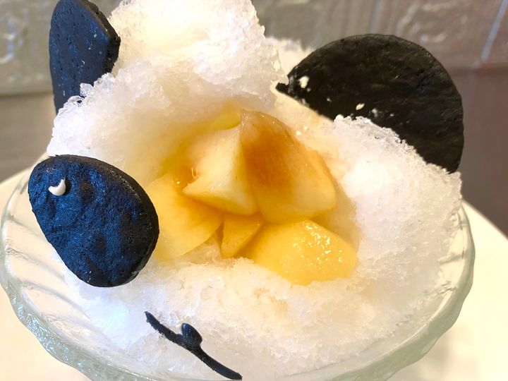 「パンダ」1700円はミルクシロップをベースとし、中に杏仁ミルクシロップと桃の果肉が入っています。パンダの目や耳は食用竹墨パウダーを使った自家製クッキーで表現。ひと口食べてみると、まずは氷のふわふわ具合に驚きました。口当たりが空気のように軟らかで、スッと消えていく感じです。杏仁ミルクの独特のいい香りが時間をかけて広がっていくのも魅力です。
