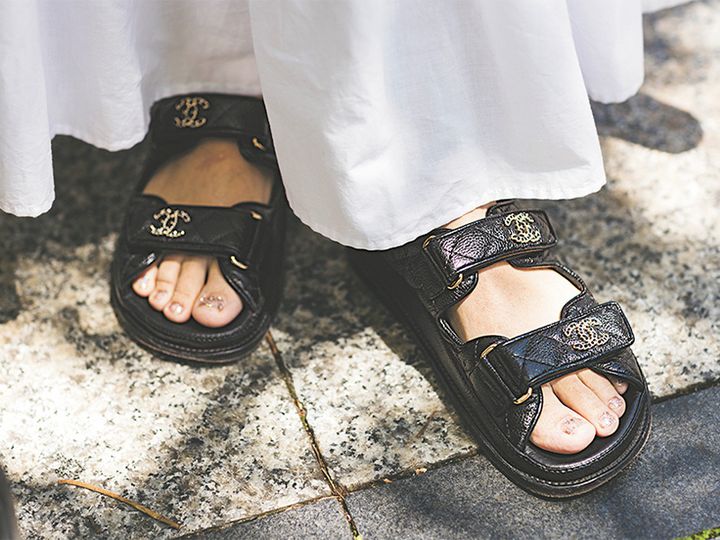 赤ちゃんを抱っこすることを考えると着る服が限られる産後。お出かけの時は以前に増して足元のおしゃれが重要に。「普段、ワンマイルではウーフォスが多いので、シャネルのサンダルの特別感がさらに気持ちを盛り上げてくれます。MY定番のモノトーンをリッチに、ママになっても愛用したい一足です」(鈴木さん)