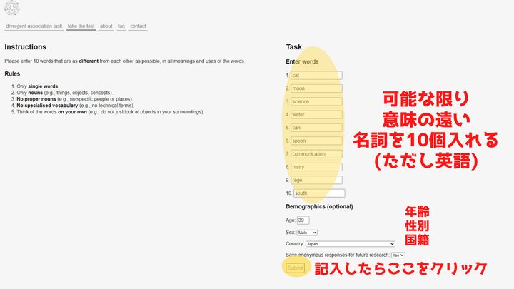 研究者たちは早速98か国の8000人以上のボランティアの人々に「意味のできるだけ離れた名詞を10個選んでもらうテスト」(DAT:Divergent Association Task)を行ってもらいました。
