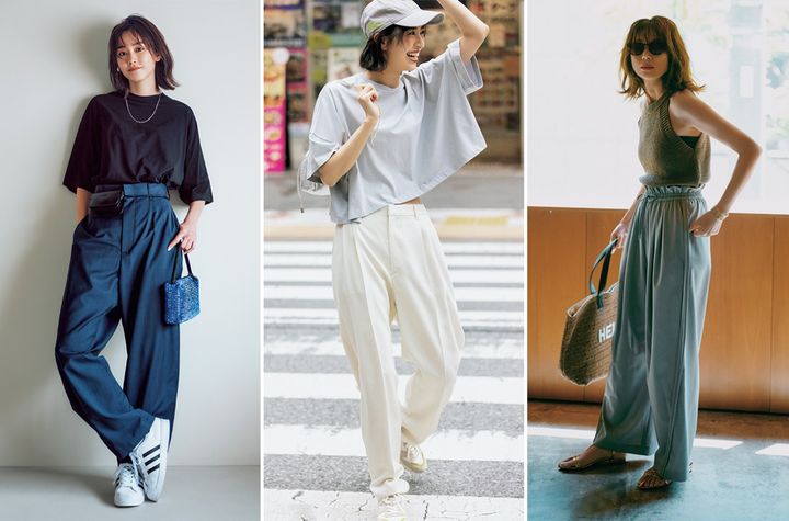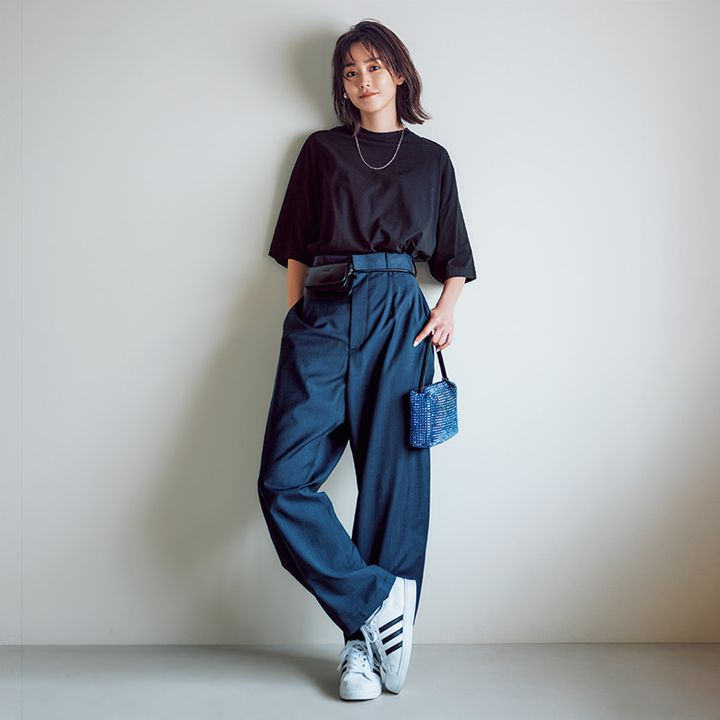 アイシーなワントーンコーデなら、猛暑でも涼しげオシャレをキープできます。タック入りのゆるパンは、脚長効果も抜群!ハイウエストと好相性な短め丈トップスでバランスをとると、こなれ見えします。