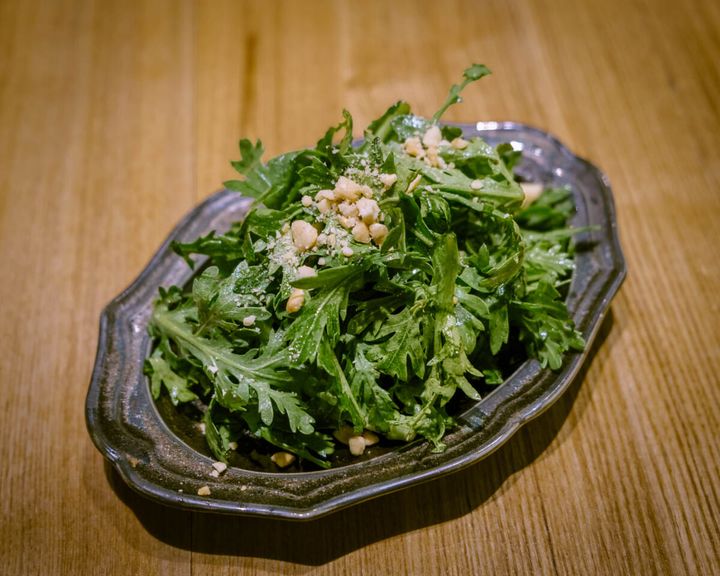 焼き鳥屋さんですがおいしい野菜料理もいろいろあります。新鮮な生野菜ということで、この「春菊生ナムル 490円」です。ごま油と塩ですっかり韓国風。柔らかくてくせのないおいしい春菊です。