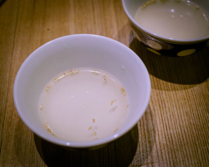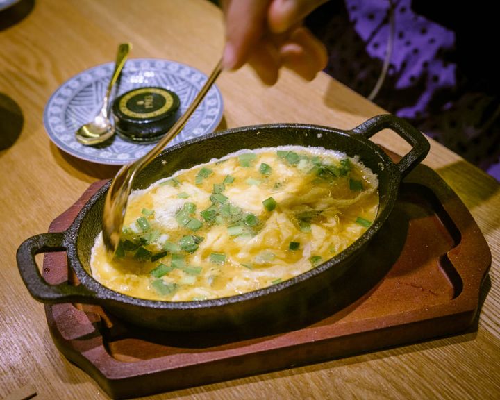 もう一品「鶏だし玉子焼き 790円」は、あっつあつの鉄板が登場して、目の前でたまごを流し入れてゆるくかき混ぜながら作ります。だしは鶏白湯なのでコクがあります。さらに取り分けた後に海苔の佃煮をお好みで。海苔の佃煮の甘しょっぱい味がたまごのうまさを引き立ててくれます。