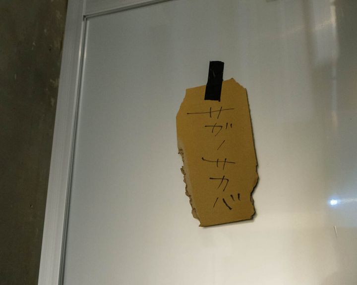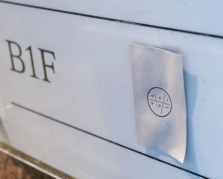 細い階段を降りていく途中、まるで工事現場にあるようなドアに、段ボールにマジックで「サガノサカバ」と書かれたものが貼られています。ちょっと怪しげな感じです。