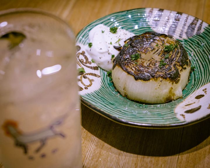 それから野菜の焼き物も。「玉葱焼サワークリーム 690円」です。佐賀の玉ねぎを時間をかけて炭火で焼いて、それをサワークリームといただきます。玉ねぎってそれだけだとあっさりですが、脂っ気が加わるとコクがプラスされてまた違ったおいしさになりますよね。サワークリームならあっさり感もあってなかなか面白い取り合わせでした。