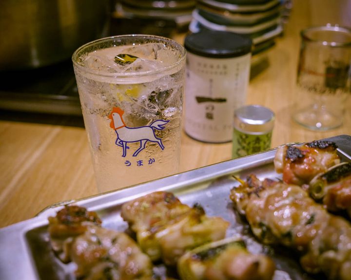 焼き鳥に振ったのは佐賀県唐津市の青唐辛子「一味唐辛子 青獅子」。唐津の貴重な国産唐辛子を使っていて、香り高く爽やかな風味と色。そしてスコヴィル値が高いということで、パンチのある辛さです。飲み物は焼酎「天山《粕取》550円」のハイボールを注文。この焼酎、その奥深い味わいは、日本酒「天山」の純米酒の酒粕を使っているからなんだそうです。