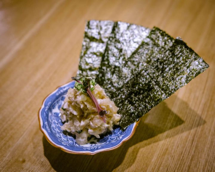 こちらは「ササミ海苔なめろう 590円」。なめろうと言えばイワシですが、こちらは鶏ささみをたたいて味噌などと和えたもの。皿から飛び出した海苔が鶏の尾のように見えてきました。