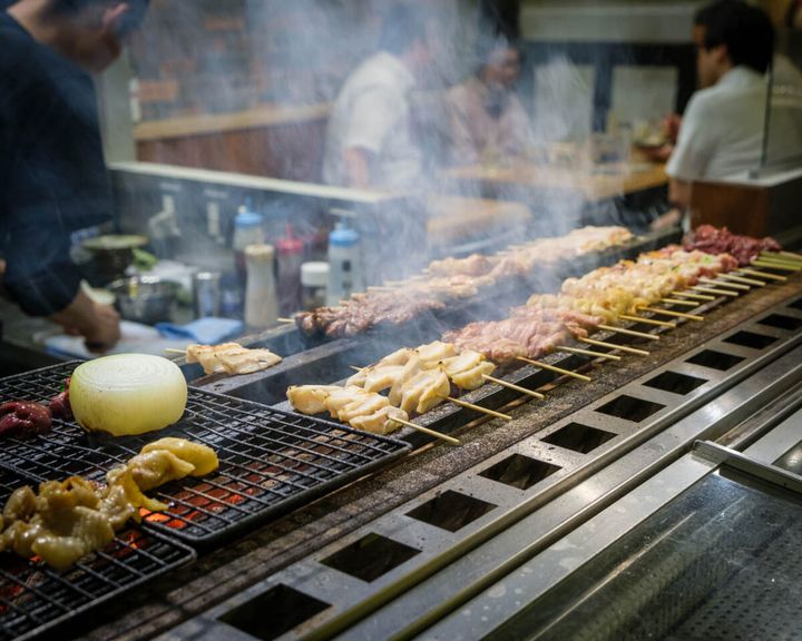 焼き場はオープンで、並んだ鶏の串がゆっくりと炭火の上に並んでいます。かなりのライブ感で煙もモクモクですが、排気はもちろんばっちりなので心配は無用。それにしても旨そうに焼けています。