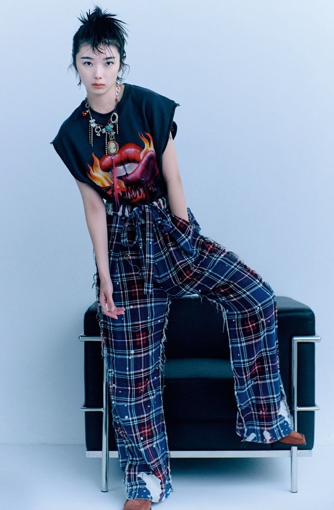大胆なプリントのトップスと、パンキッシュなチェック柄パンツの辛口な装い。アクセサリーやヘアスタイルで遊び心をプラス。「ハードになりすぎないよう、小物は中和してくれるものを選びたい。ネックレスとリングはゴツめですが、ピンクのエクステやパールのあしらいに甘さも漂います」