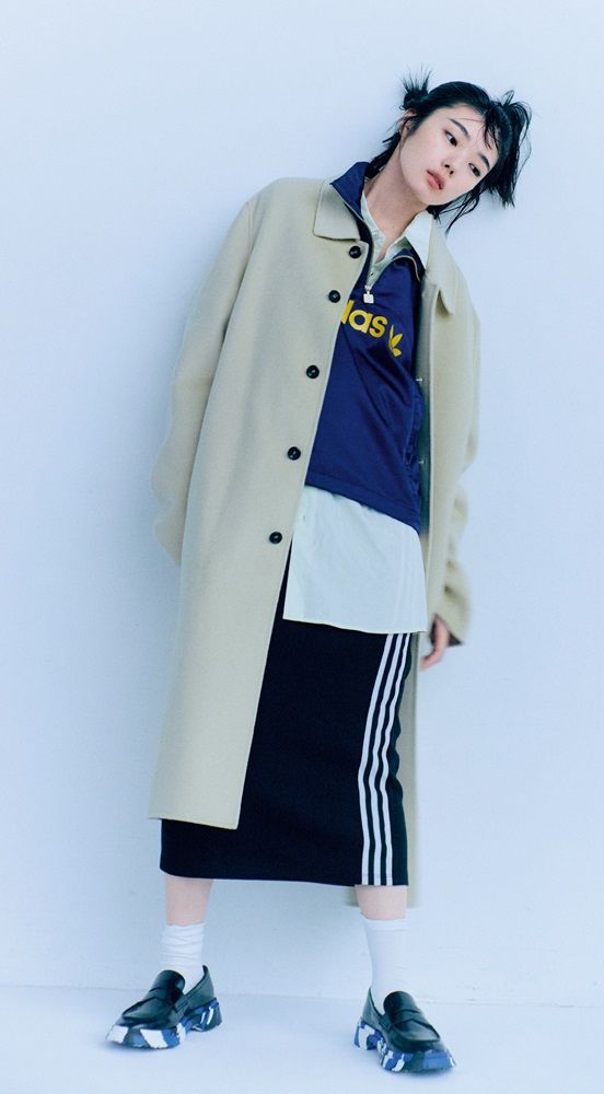 コート¥121,000 シャツ¥41,800(共にアタッチメント/サカス ピーアール TEL:03・6447・2762) ハーフジップブルゾン¥13,200 ニットスカート¥10,450(共にアディダス オリジナルス/アディダスお客様窓口 TEL:0570・033・033) シューズ¥31,900(カンペール/カンペール ジャパン TEL:03・5412・1844) その他はスタイリスト私物