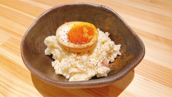 こちらはお店のおすすめメニューの、ポテトサラダ(480円)。とろとろの半熟卵がのっています。クリーミーな食感で人気メニューなのも納得です。