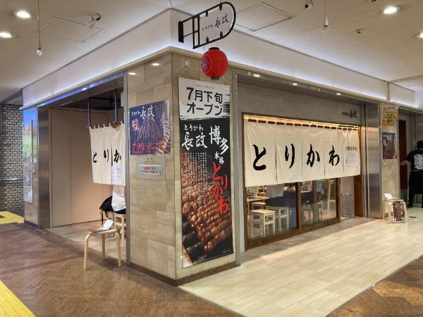 博多駅の博多駅地下街に、とりかわと串焼きのお店「とりかわ長政」が7月29日にニューオープンとのことで、内覧会に行ってきました。