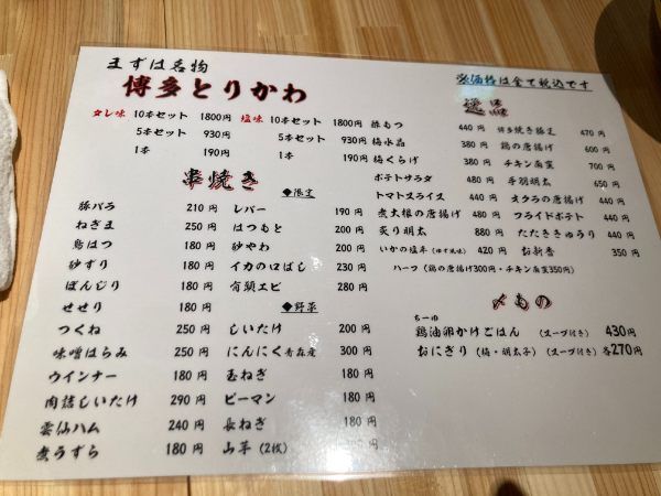 こちらのお店は、関東で長年とりかわの串を広めてきた「博多とりかわ長政」の福岡初の店舗。