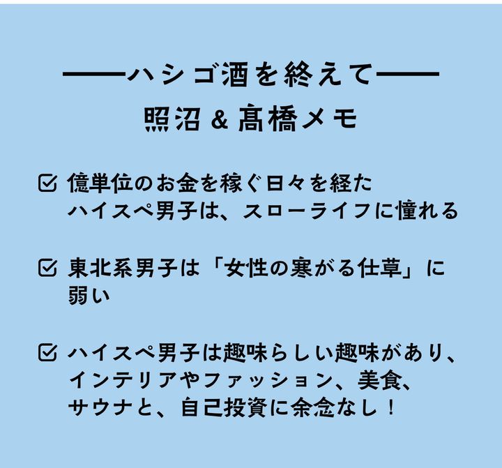 さまざまな職業のハイスぺ男子が登場し、行きつけのお店でハシゴ酒をしながら語り合う本連載。