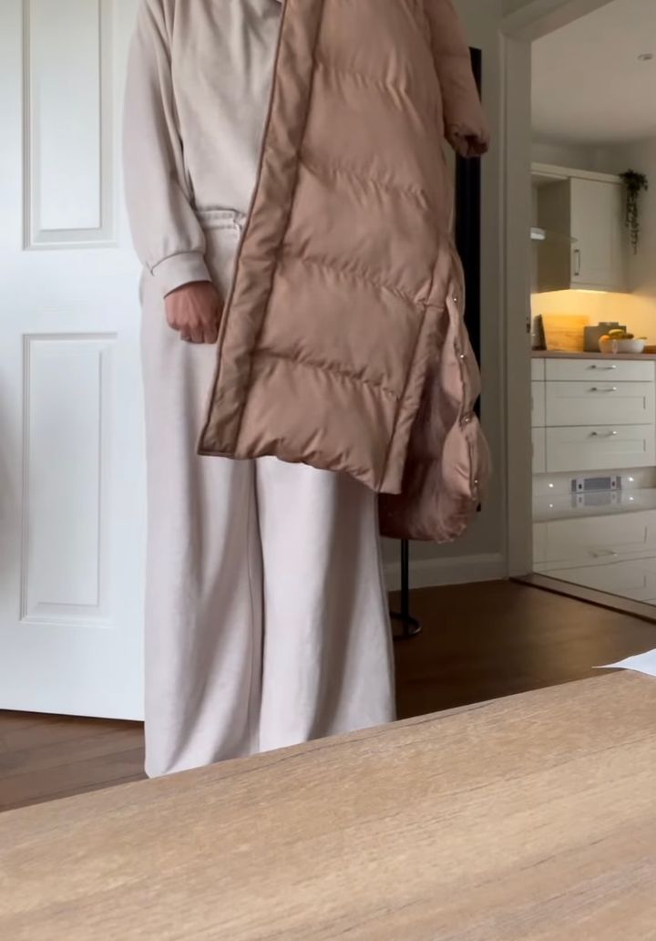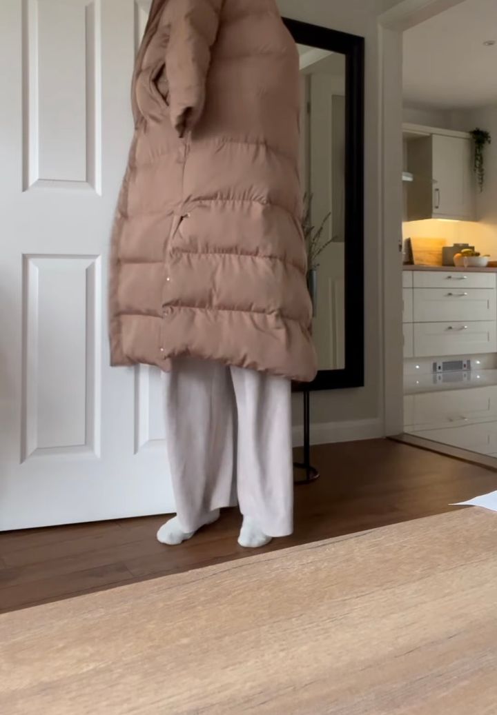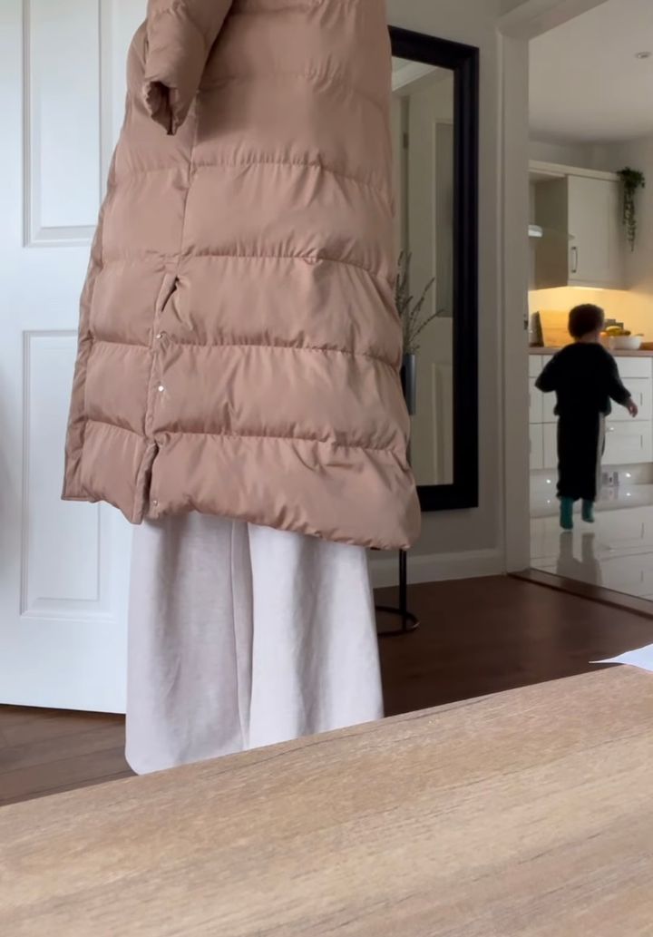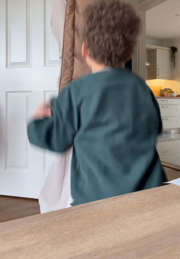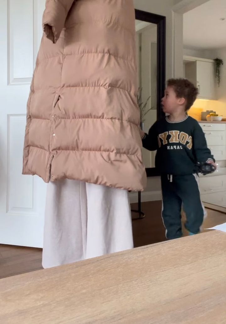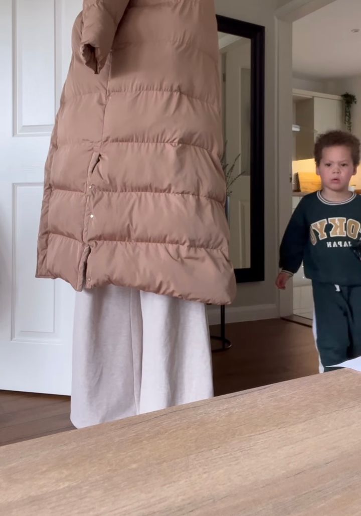 コートの中にママが隠れているとは気づかず、キッチンへ探しに行った息子くん。