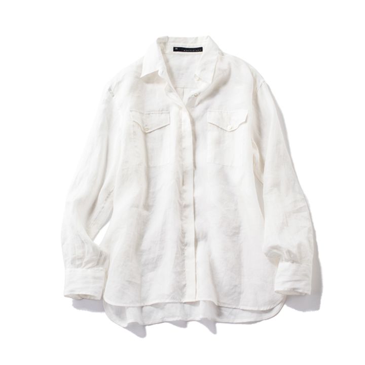 羽織って、巻いて、重ねて…万能の白シャツは透け感のあるリネンで。¥31,900(マルティニーク/マルティニーク ルミネ横浜)