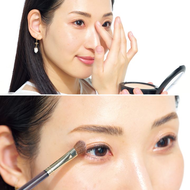 下/「ほんのりピンクのラメアイシャドウをアイホール全体に入れてくぼみを光で飛ばします。単色使いですっきりしたメリハリを作ります」