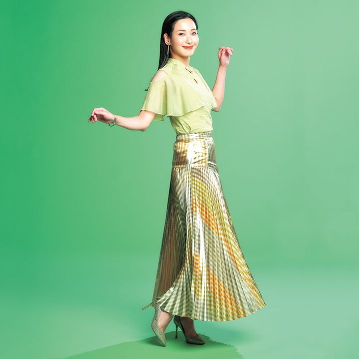 ワンピース〈トップスとして〉¥9,580(ワイルドリリー)スカート¥22,000(アメリ/アメリヴィンテージ)イヤリング¥14,300(ランバン オン ブルー/ヴァンドームヤマダ)ブレスレット、リング、シューズ/すべてスタイリスト私物
