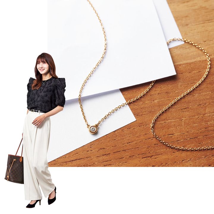 前職では制服着用、アクセサリーは禁止されていました。一方、転職が決まった先は私服勤務。オフィスカジュアルに馴染み、どんな時も嫌味なく身につけられるジュエリーが欲しくて選びました。決め手は一粒ダイヤのサイズ感がしっくりきたことと、肌に馴染むピンクゴールドの地金。平日も休日も1本でさらっと身につけるのがお気に入り。転職記念に手にしてから気づけば10年、ずっとスタメンで活躍中のネックレスです。