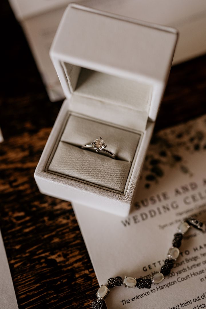 私たちは2020年のクリスマスの日に婚約しました。アヴィクが朝日を見に朝の散歩に行こう、と私を説き伏せたのです。後から考えれば、それがサインでした。彼は早起きでもないし、朝の散歩をする人でもないんです。ハンプトン・コートの脇の川に沿って歩いていて、アヴィクの方を向くと、彼が片膝をついて、エンゲージリングを持っていました。ひねったプラチナのアームにラウンドカット・ダイヤモンドがついたものです。彼が数週間前に家族と選びました。今でも、このサプライズに感動しています。