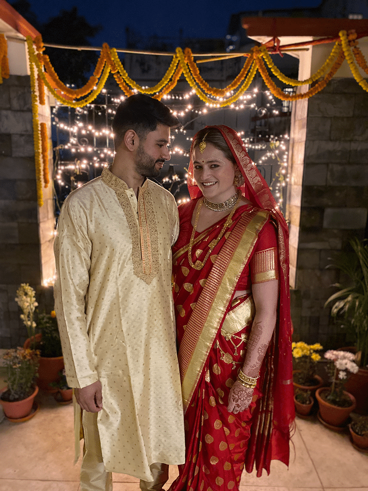 ゲイ・ホルドで着たシンプルな黄色のサリーから、伝統的な赤と金のサリーに着替えました。インドの文化では、白は喪を象徴する色なので、結婚式の日に花嫁が白を着ることは極めてまれです。その代わり、花嫁衣装として伝統的な色は赤で、金のディテールやアクセサリーをよく組み合わせます。赤はヒンドゥー教では縁起のいい色で、多産、繁栄、新たな始まり、愛を象徴します。