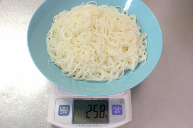 そうめんを5回、掴み押しして水切りした「時短水切り」そうめん。こちらも計量してみると、お皿の重さを除いて258gでした。