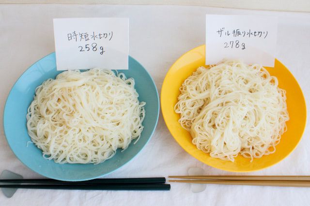 茹でたそうめんを食べるためには、水切りが必須。ザルをチャッチャッと振って水切りしただけのそうめんと、「時短水切り」したそうめんを、比較してみます!