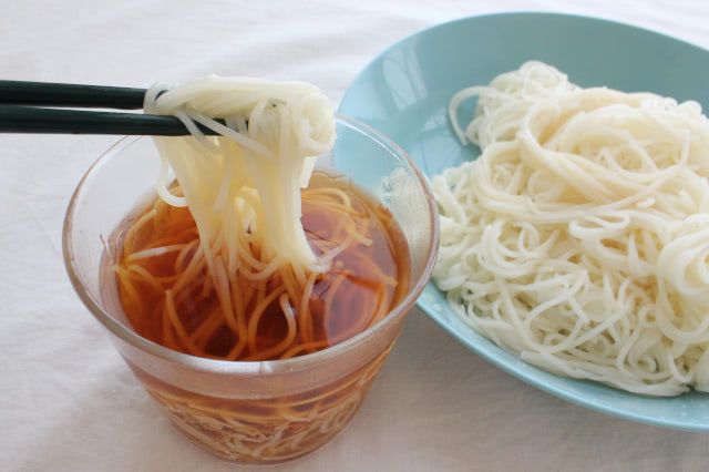 めんつゆに浸して食べてみると…。それほど水っぽさを感じず、そうめんのコシもしっかり。おいしくいただけます。