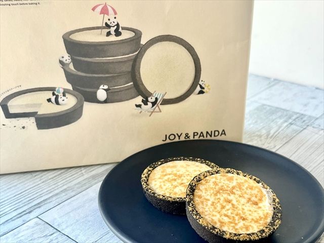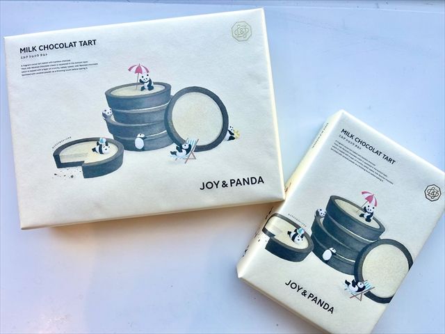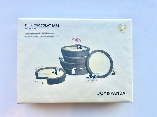 白と黒を基調としたモノトーン風のパッケージ。よく見てみると、小さいパンダがタルトの周りで遊んでいます。