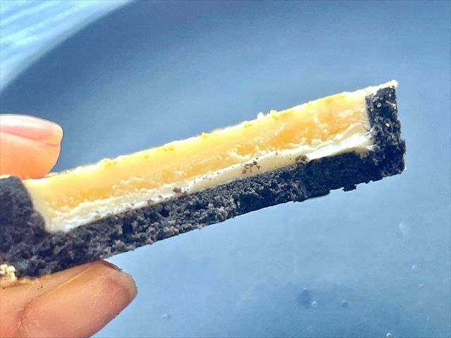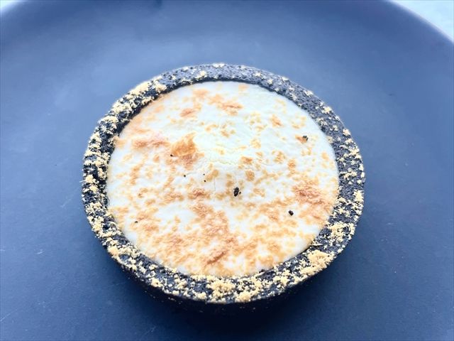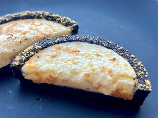 パッケージと同様、黒と白のシンプルな見た目のタルト。直径約6cmで、高さは約1cmとパクっと食べられる大きさです。