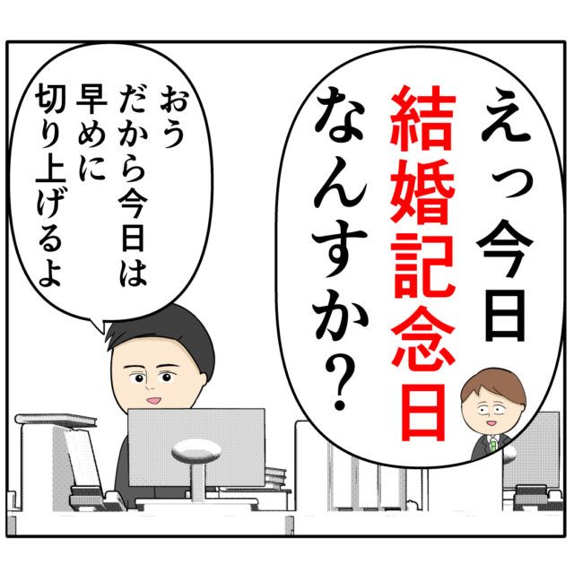 結婚記念日当日、職場の後輩に「早めに切り上げる」と宣言する良し男さん。