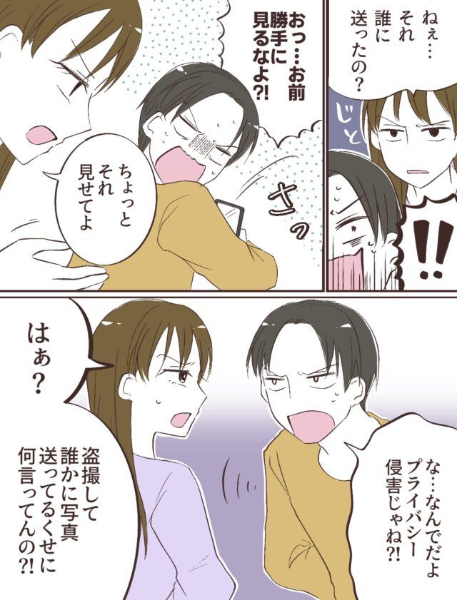 「ねぇ・・それ誰に送ったの?」夫の背後でそう呟くと「うわ!!」驚いて「おっ・・お前勝手に見るなよ!?」慌ててスマホを隠す夫に「ちょっとそれ見せてよ」と詰め寄ったところ「な・・なんでだよ。プライバシー侵害じゃね!?」と反論、すかさず「はぁ?盗撮して誰かに写真送ってるくせに何言ってんの!?」と返しました。