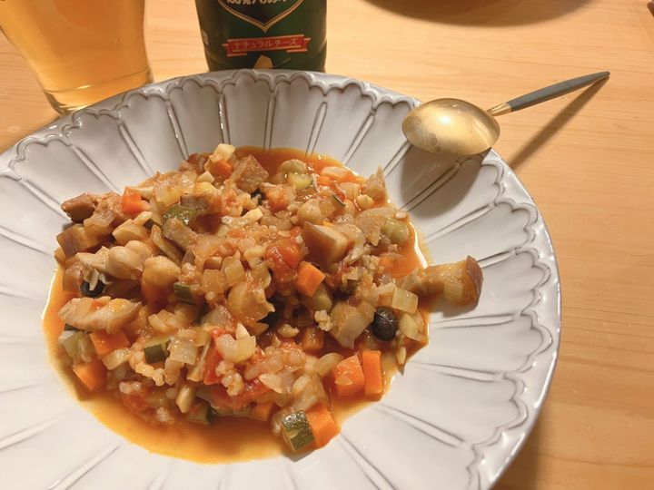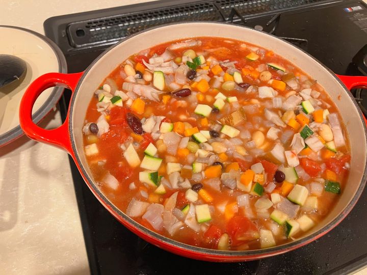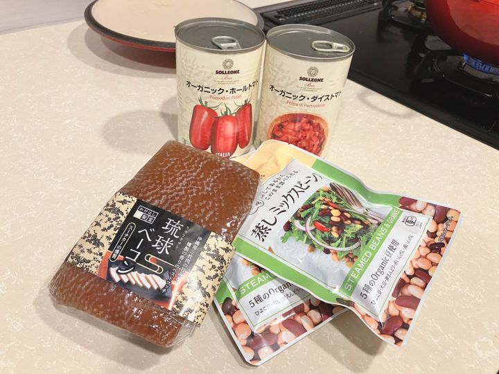 鍋にオリーブオイルを入れて、お気に入りの琉球ベーコンを炒めたら、細かく切った野菜を炒めて、トマト缶とミックスビーンズを入れてコトコト。