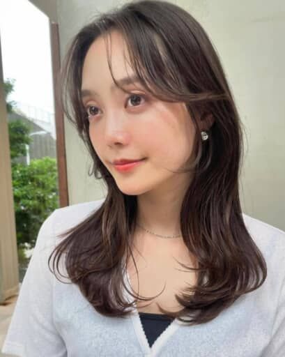 レングスは肩下くらいが目安で、前髪はサイドに流すか軽めのシースルーバングを。レイヤーを多めに入れておきつつ、スタイリング時は太めのヘアアイロンを使用してゆるくくびれを作るのがポイントです。また、ツヤ感が高まるダークブラウン系のヘアカラーを合わせつつオイル系のスタイリング剤でツヤ感を補うと、今っぽ感がさらに引き立ちます。