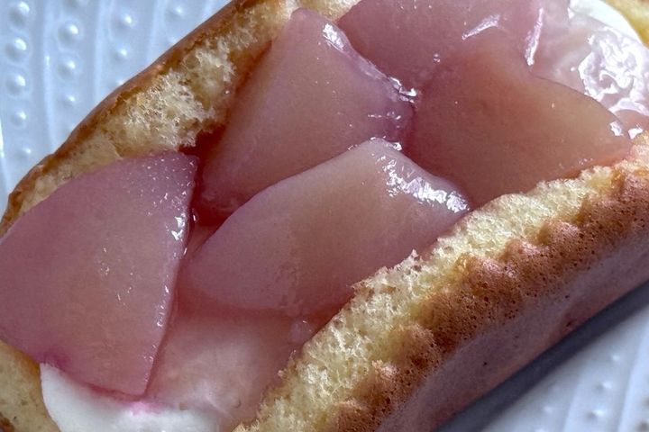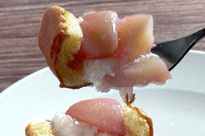 カステラ状のスポンジ生地で、ホイップクリームと大ぶりにカットされた桃のコンポートが挟まれたスイーツです。