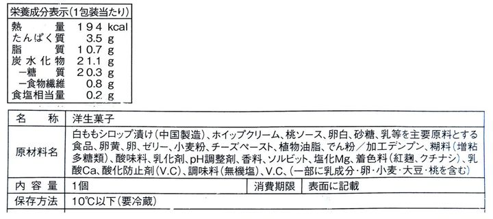 次にご紹介するのは「ごろごろとした桃のオムレット」329円。こちらもパッケージに、断面のイメージ写真が掲載されています。