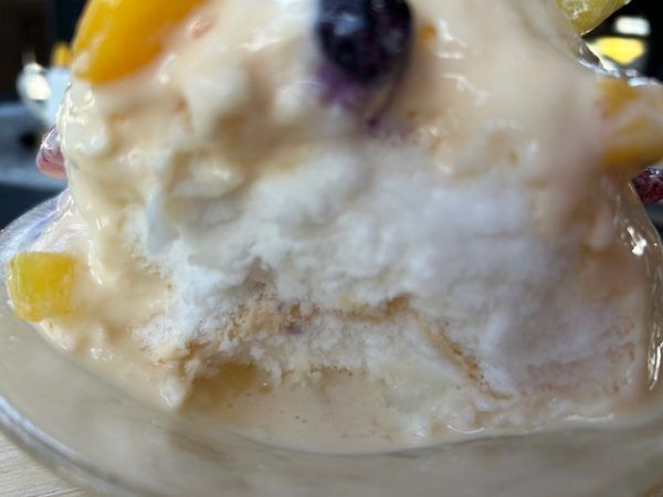 フルーツたっぷり、練乳たっぷりのビジュアルがたまりません。かき氷といえば「しろくま」系が大好きです。この練乳は自家製なのだそうです。市販の練乳より色が濃いのですが、甘味はあっさりしていてベタつく感じもあまりなかったです。 氷はさらさらできめが細かくて、うま〜い。とけるのが早いので、焦って食べちゃいます。焦って食べると、すぐにアタマにきーんと来ちゃうのですが、これだけ細かく柔らかい氷だと来ませんね。いくらでも食べてしまいそうです。