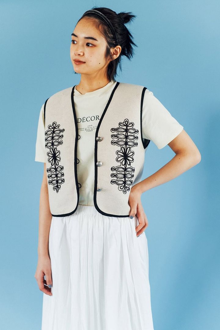 プリミティブな刺しゅうがかわいいベストはシンプルなスタイルの味つけに便利。