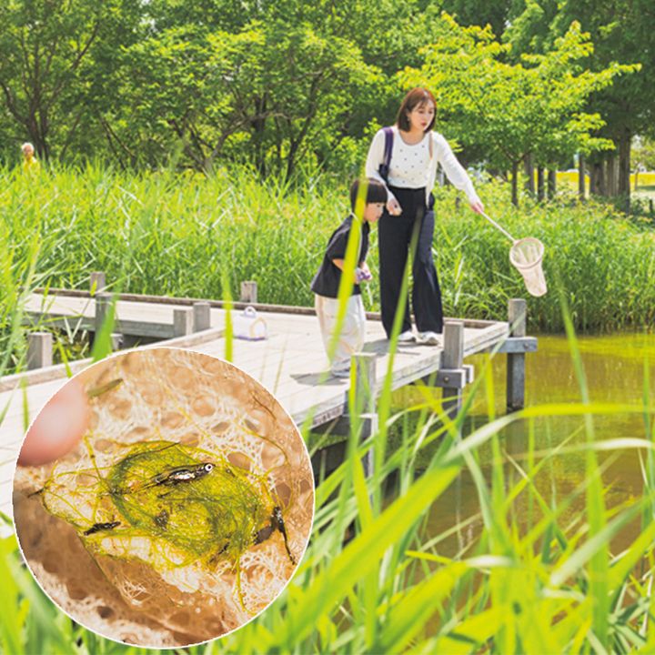 水辺の生き物に興味津々で、アメンボやメダカなどを観察。メダカを網で掬い上げたら、その後はきちんとリリースするのがお約束。命の尊さを伝える貴重な機会でもあります。