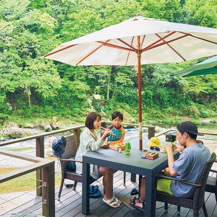 黒茶屋で購入できるお弁当は、施設内の水の音テラスで食べることができます。開放的なテラスで川を眺めながら食べるお弁当はまさに絶品