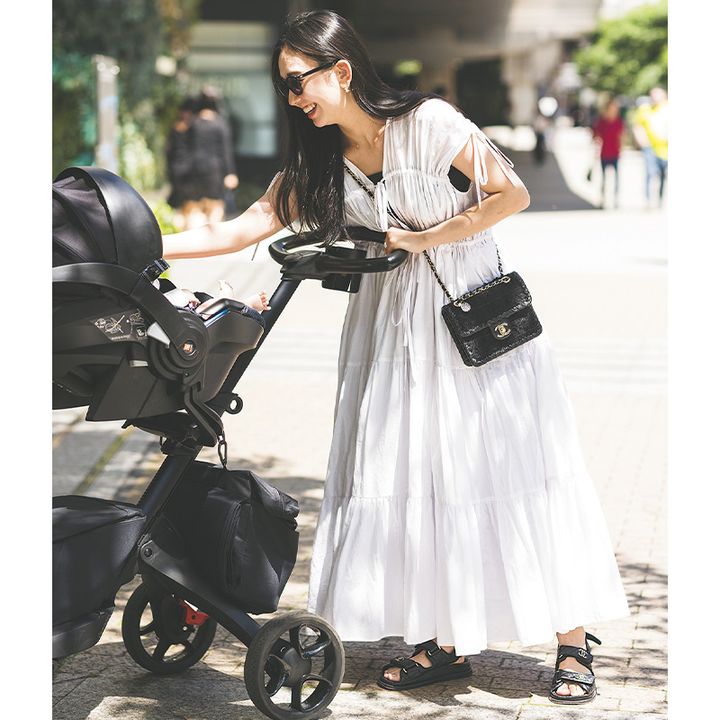 今年2月に第一子を出産した鈴木さん。服の自由が減る産後、カートでのお出かけは足元を主役にしたおしゃれを開拓中。産後の体形悩みもカバーできるワンピースを中心に、気分を上げてくれるフラット靴を楽しんでいました。