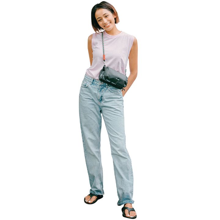 コンパクトなトップスに動きやすいパンツが公園での定番。「形と肌触りが好みなピンクのタンクトップはHanesのもの。ZARAのデニムは太すぎず細すぎずが最近の気分にフィット。汚れても洗えばいいやと思えると、ストレスがなく外で過ごせる気がして。すぐに脱ぎはきでき多少濡れてもOKなウーフォスは夫婦で愛用中」
