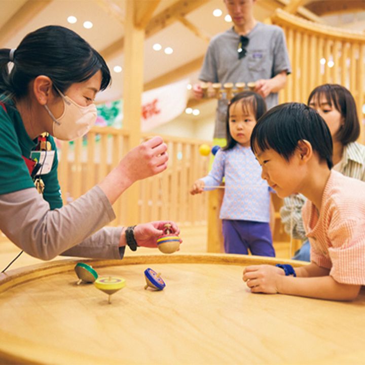 豊かな森の恵みを生かした体験型室内施設。木のおもちゃと遊びが大充実。隣接するおもちゃ工房ではワークショップが開催されることも。