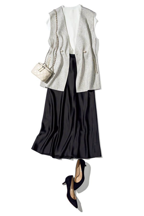 上品な光沢を放つスカートは、とろみのある落ち感もドレッシー。×ジレなどでフォーマル感を高めれば、リュクスなお店にも釣り合うリッチな装いに。