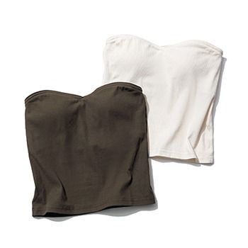 ストラップレスで、より服のように着られるベア。こころもとない安定感は、ふちの内側に仕込まれたすべり止めで解決。アンダーバストにもゴム入りで抜群のフィット力。 カップつきベアトップ/ともにSeaRoomlynn 地厚なリブ生地でインナー感を軽減。