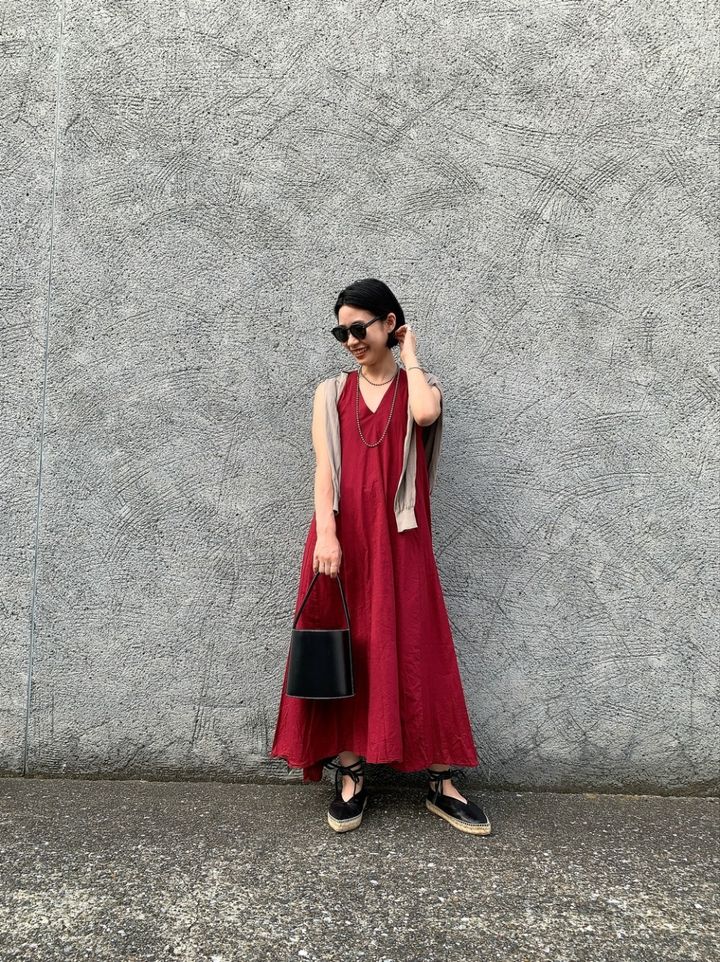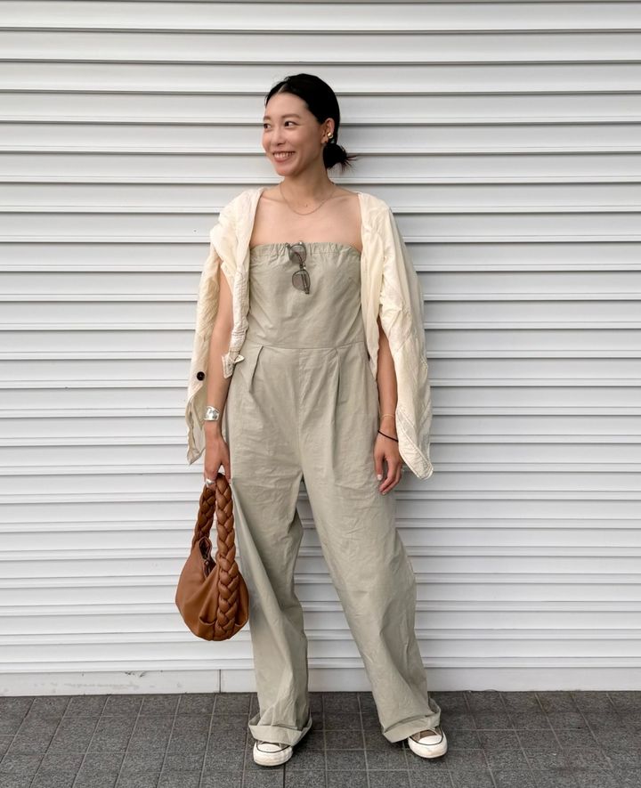 どこか秋を感じるトーンに肌見せや小物で軽さをプラス。「カジュアルなアイテム同士の組み合わせですが、ニットベストの深めにあいたVネックのおかけでヌケ感を演出。カジュアルなスタイルを大人っぽくアップデートしてみました」