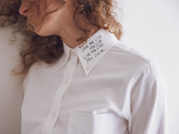 1枚で着ても、インナーとして仕込んでも埋もれることなく目にとまる、えり元のデザイン性。古きよきオックスフォードシャツもお堅さがほぐれて親しみがわく。手書き風のやわらかな文字で愛嬌も加算。 白メッセージカラーシャツ/マディソンブルー