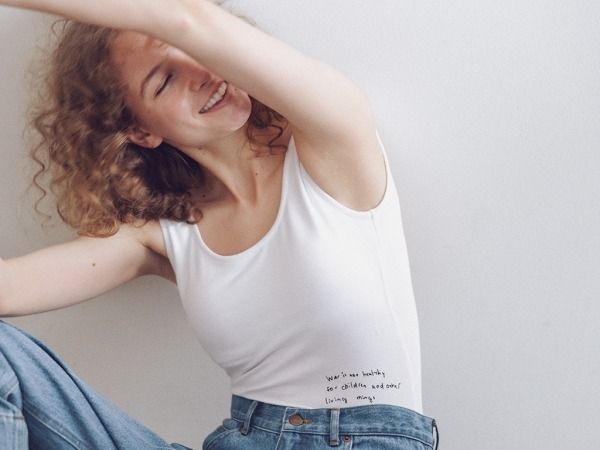 サイドのウエストに小さく入れたさりげなさ。ボトムやアウターから見え隠れさせることで、ミニマルな装いでも手抜きに見えず、凝った印象へと近づける。 白メッセージボディースーツ/ピース(ガリャルダガランテ 青山店)