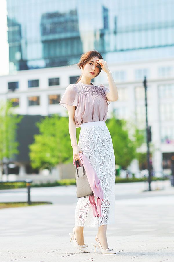 シャープなホワイトレースを一面に敷いたロング丈のナロースカートで、ピンクのふんわりブラウスを大人顔にアレンジ。