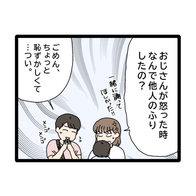 「おじさんが怒った時なんで他人のふりしたの?一緒に謝ってほしかった!!」と花さんがひできさんに言いました。